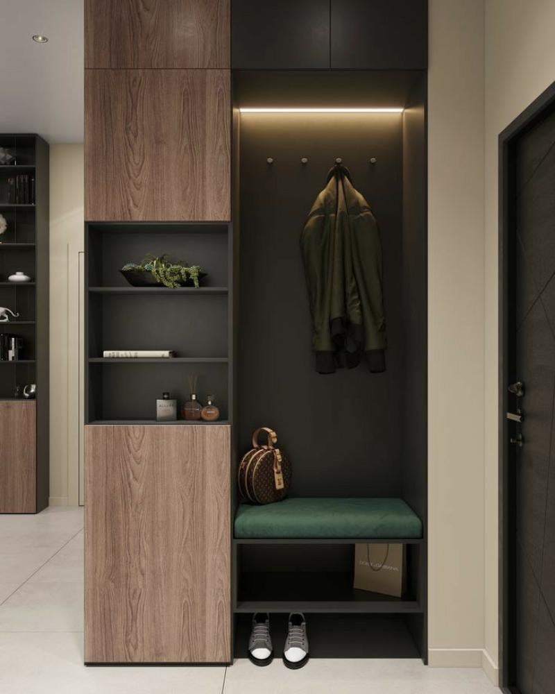 هذا التصميم يُعتبر مثالي لتقسيم المساحات بطريقة أنيقة، مع توفير حلول تخزين ذكية وعملية للمداخل.