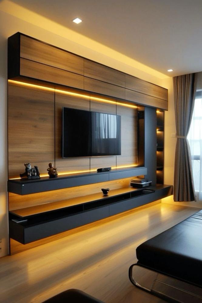 يتمركز التصميم حول لوح جداري خشبي داكن، بتشطيبات لامعة تضفي فخامة وعمقًا بصريًا على المكان. يمتد على جانبيه أرفف جانبية عصرية توفر مساحة مثالية لعرض الديكورات، الكتب أو مكبرات الصوت. بينما تضيف الرفوف السفلية العائمة لمسة من الخفة والبساطة التي تليق بالمنازل الحديثة.